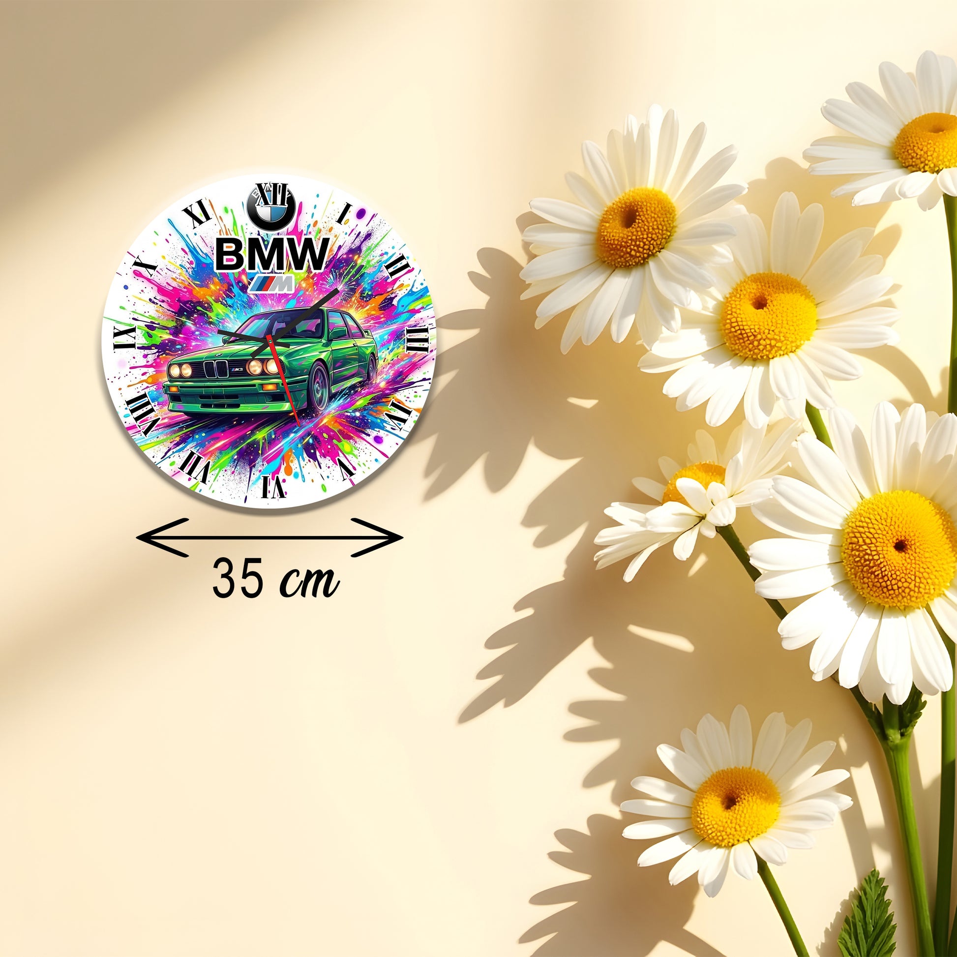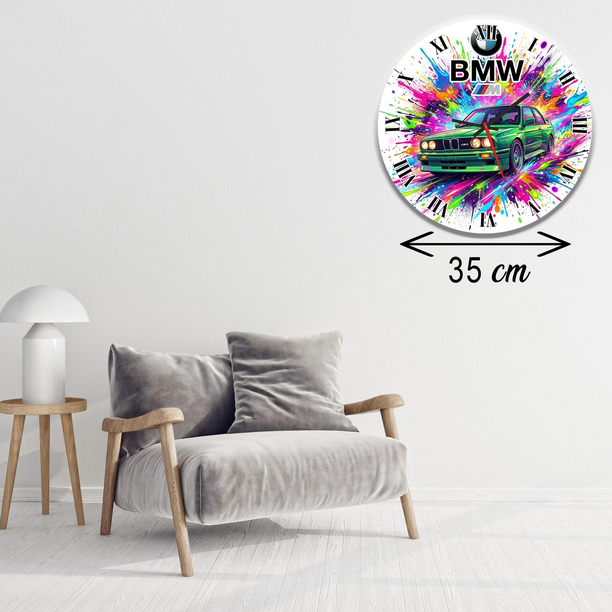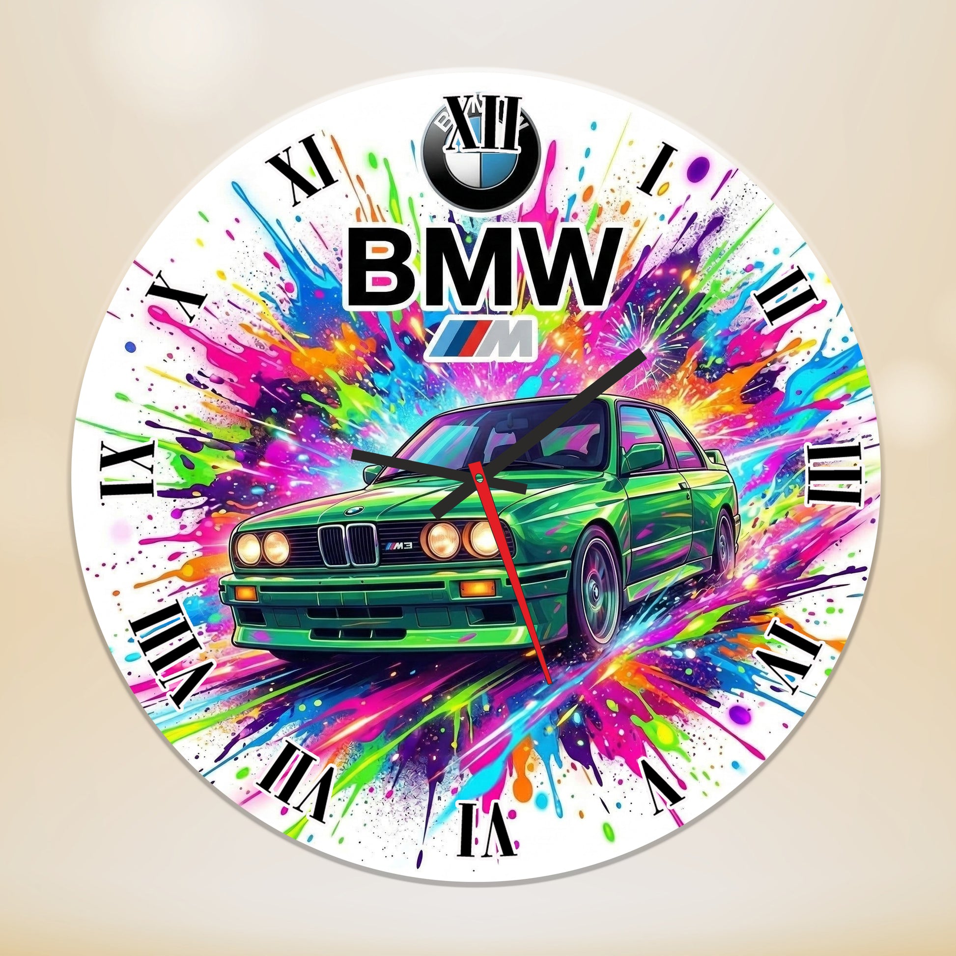 Transformă orice încăpere cu un element de decor plin de energie! Ceasul de perete cu tematică BMW E30 M3 este alegerea perfectă pentru iubitorii de cai putere și de design auto clasic. Cu o grafică modernă, stil pop-art / splash color, acest ceas nu doar că îți indică timpul cu precizie, dar devine și piesa centrală a peretelui tău.