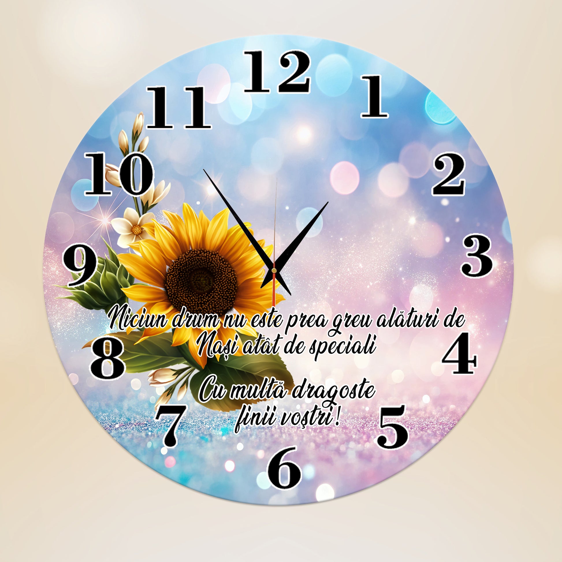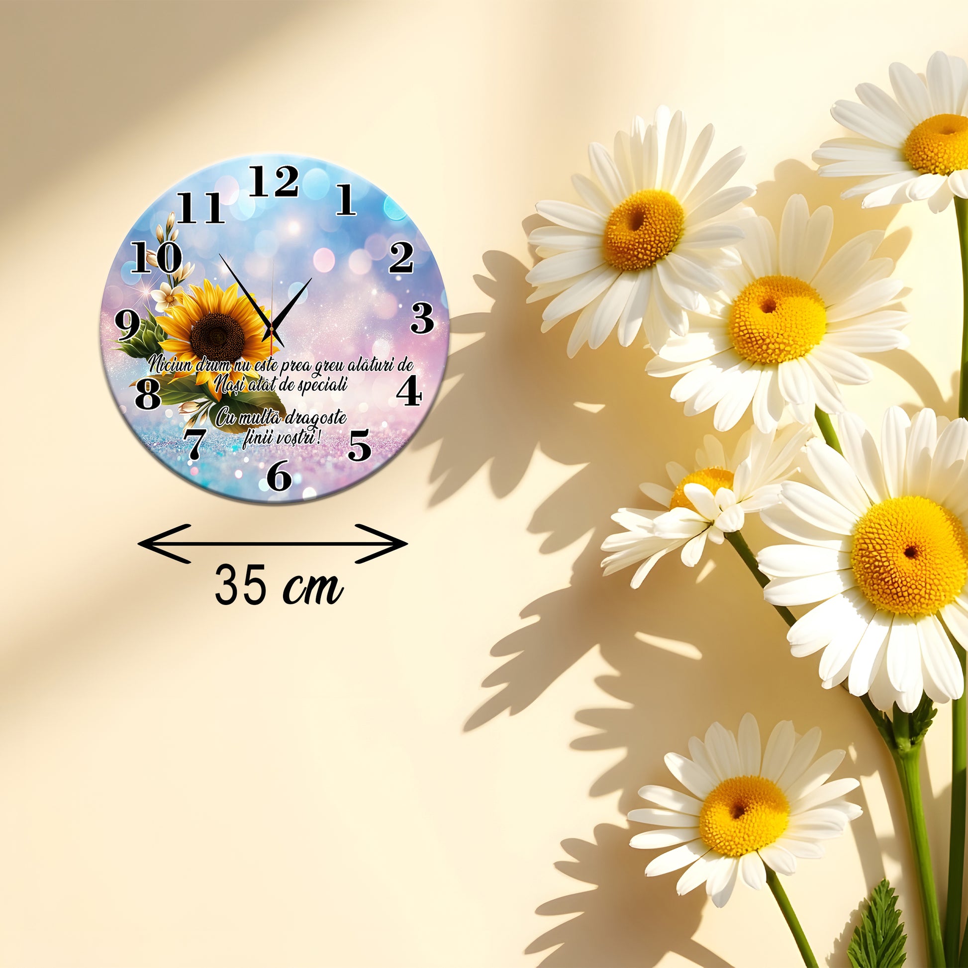 Acest ceas de perete decorativ este mai mult decât un simplu instrument de măsurare a timpului; este o declarație de dragoste și recunoștință pentru nașii tăi. Cu un design vibrant ce pune în centrul atenției o floarea-soarelui luminoasă pe un fundal de vis în nuanțe pastelate, ceasul se va integra perfect în orice decor, aducând o pată de culoare și emoție în casa lor.