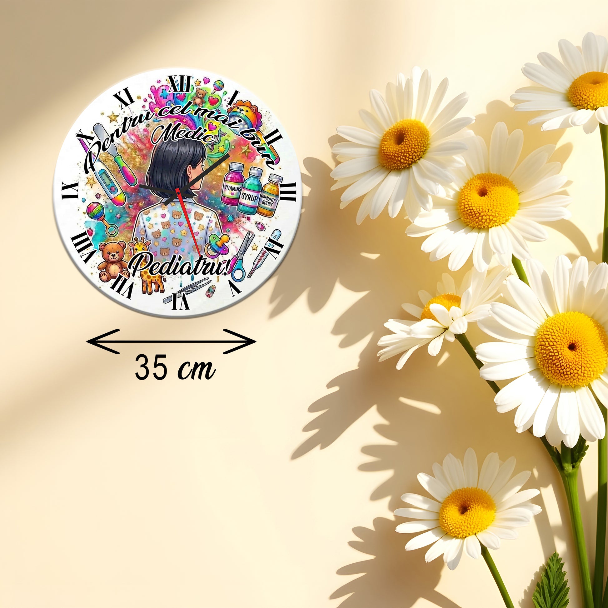 Acest ceas de perete nu este doar un instrument de măsurare a timpului, ci o adevărată declarație de apreciere pentru eroii care au grijă de sănătatea celor mici. Cu mesajul central „Pentru cel mai bun Medic Pediatru!”, ceasul devine cadoul ideal pentru a mulțumi doctorului care v-a fost alături sau pentru a felicita un coleg de breaslă pasionat.