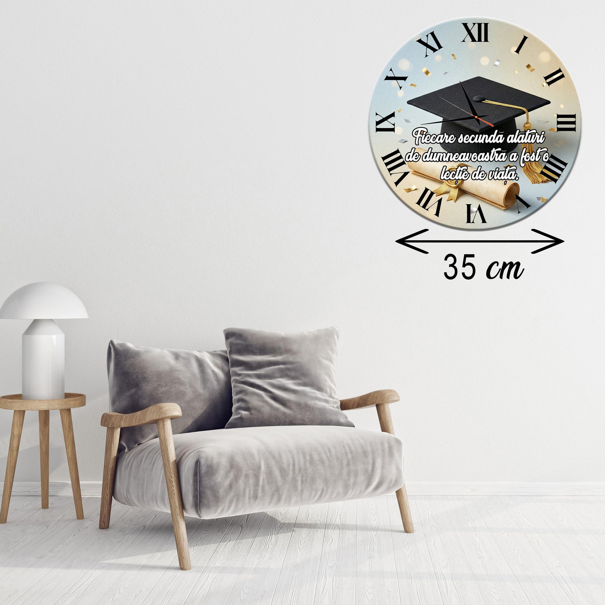 Dimensiune Generoasă: Cu un diametru de 35 cm, ceasul devine un punct central de atracție în orice încăpere.