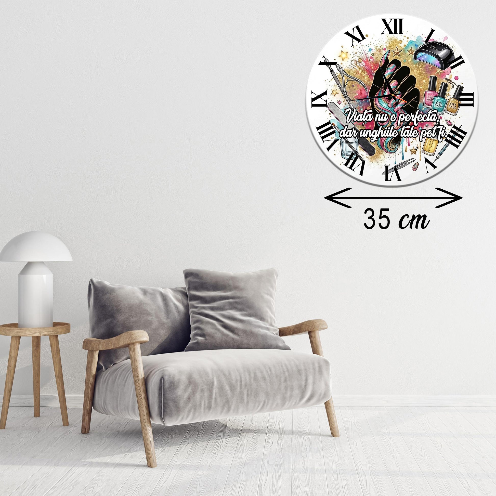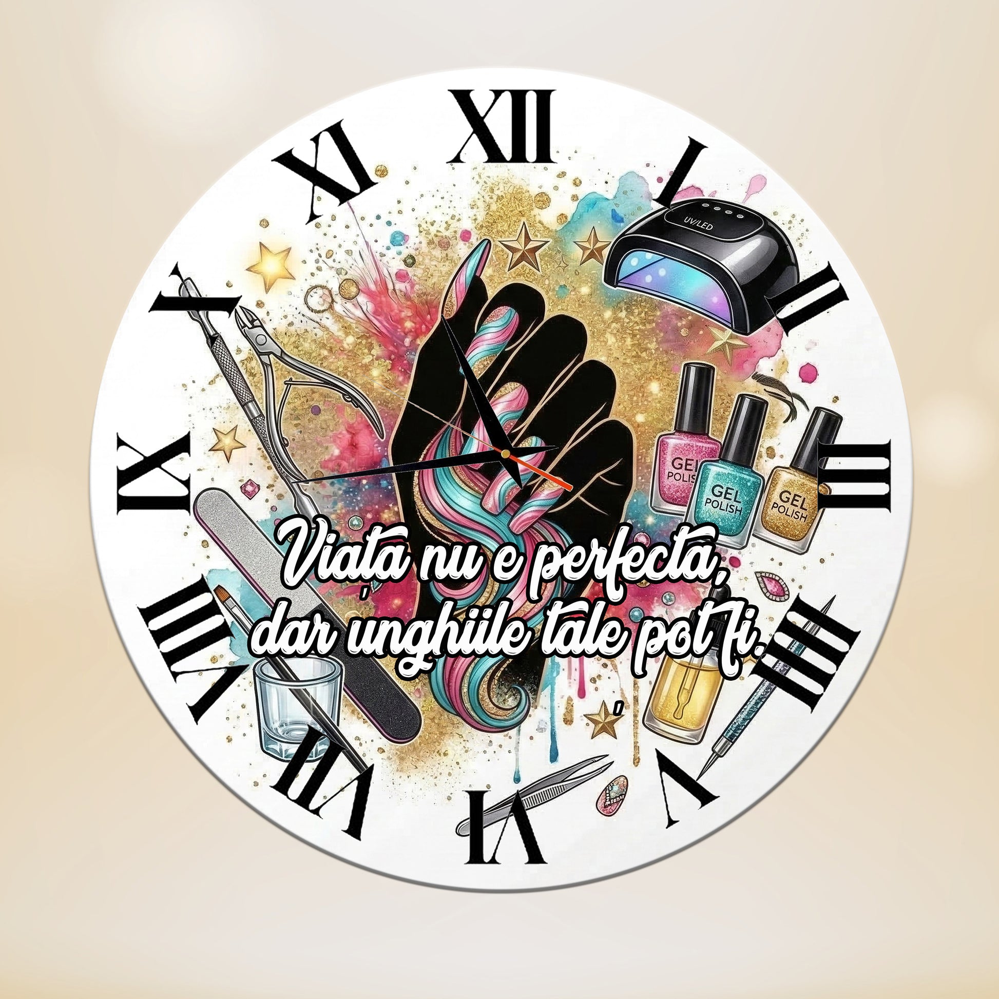 Adaugă un strop de stil și profesionalism salonului tău sau surprinde-ți manichiurista preferată cu un cadou deosebit! Acest ceas de perete este creat special pentru spațiile dedicate frumuseții, îmbinând utilul cu un design artistic vibrant.