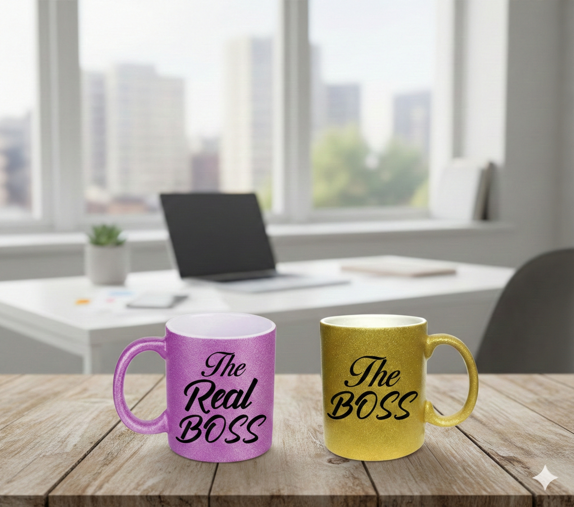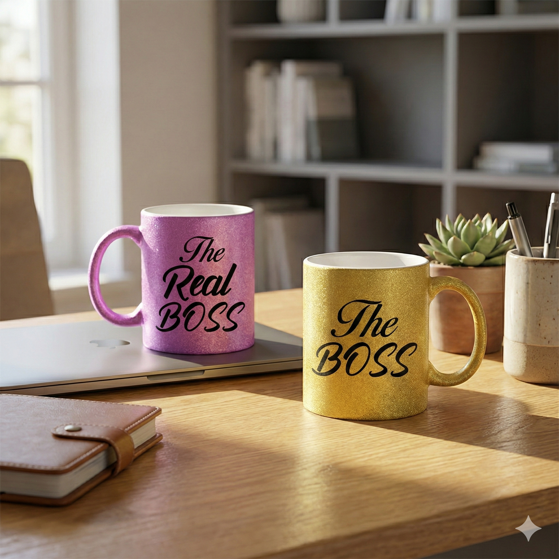 Aduceți o notă de umor și strălucire în diminețile voastre cu acest set de căni "The Real BOSS & The BOSS". Conceput pentru cuplurile care știu să se distreze pe seama dinamicii lor, acest set este cadoul perfect pentru aniversări, nunți, sau pur și simplu pentru a vă surprinde partenerul. Fiecare cană are un design unic, strălucitor, care va atrage toate privirile, fie că savurați cafeaua acasă sau la birou.